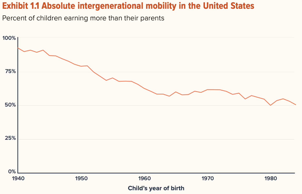 Economic mobility in the U.S. has been declining for decades. In 1940, 90% of children outearned their parents—today, that number has dropped below 50%.